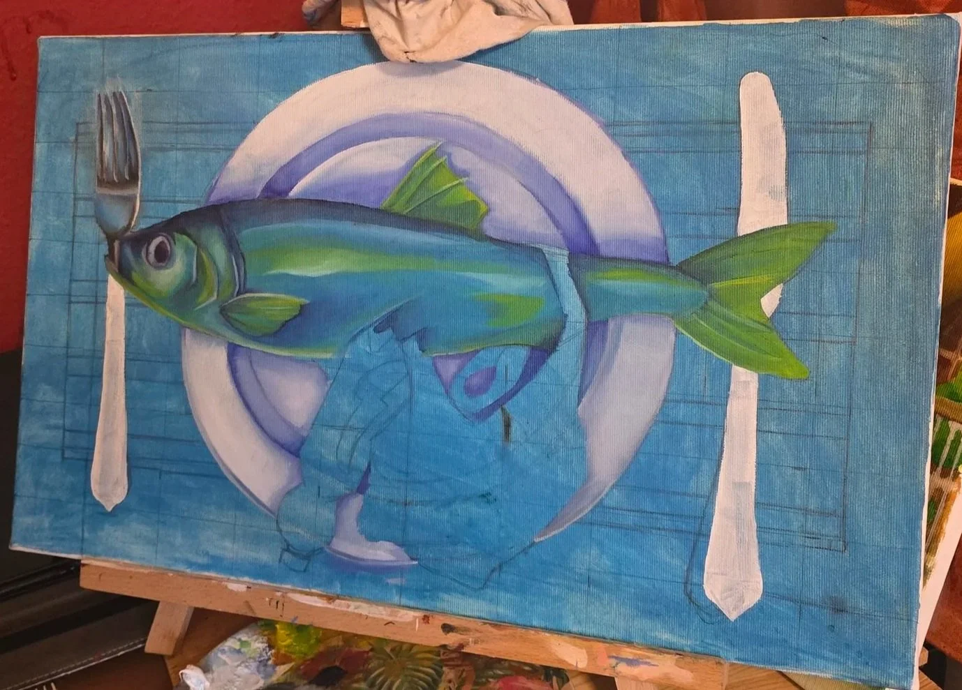 Daily Fish critizises the discarding of plastic trash into the oceans and shows how this affects us in forms of microplastics in seafood. It shows a mackerel with its stomack filled with garbage. The plastic is excentuated, though arguably not less dangerous.